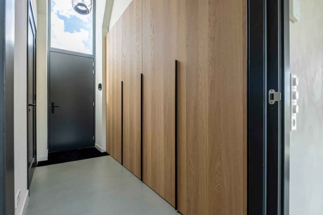 Door het subtiele lijnenspel en de perfecte afwerking vormt de kast een natuurlijk onderdeel van de ruimte. Een op maat gemaakte oplossing die niet alleen praktisch is, maar de entree ook stijl en karakter geeft.