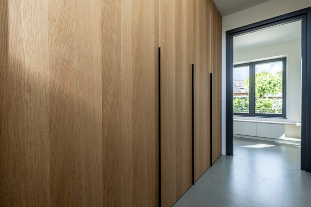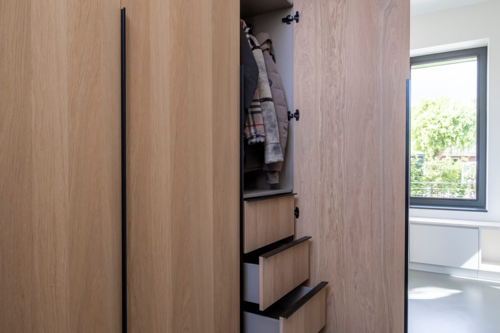 De hoge fronten in warm eikenfineer en de strakke zwarte grepen geven de hal een moderne, elegante look. Achter de greeploze deuren schuilt een doordachte indeling met laden, garderoberuimte en opbergnissen – volledig afgestemd op de wensen van de bewoners.
