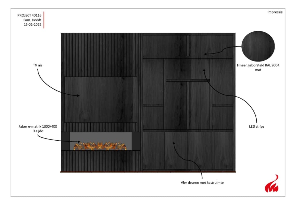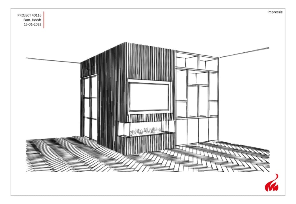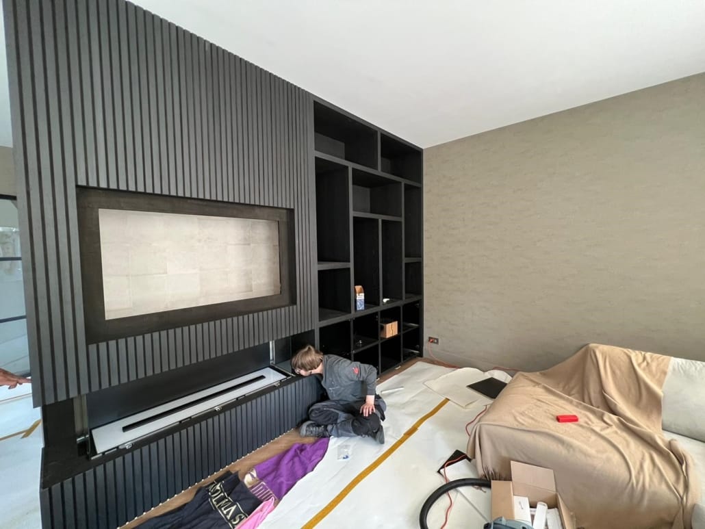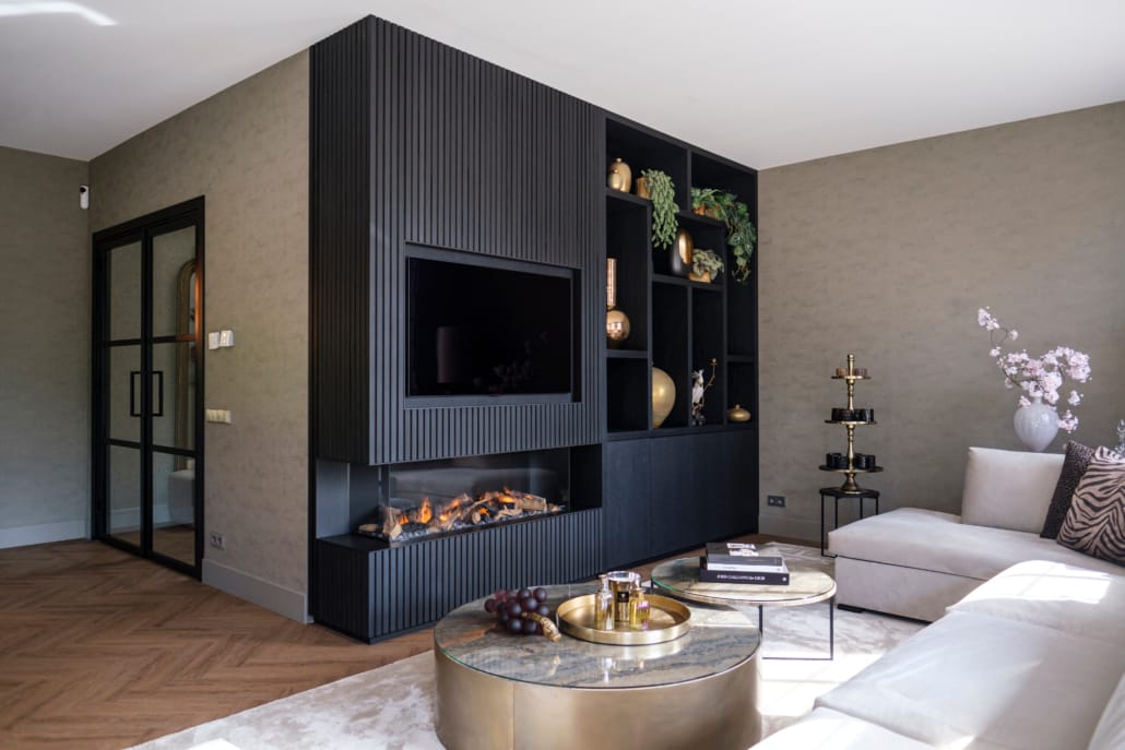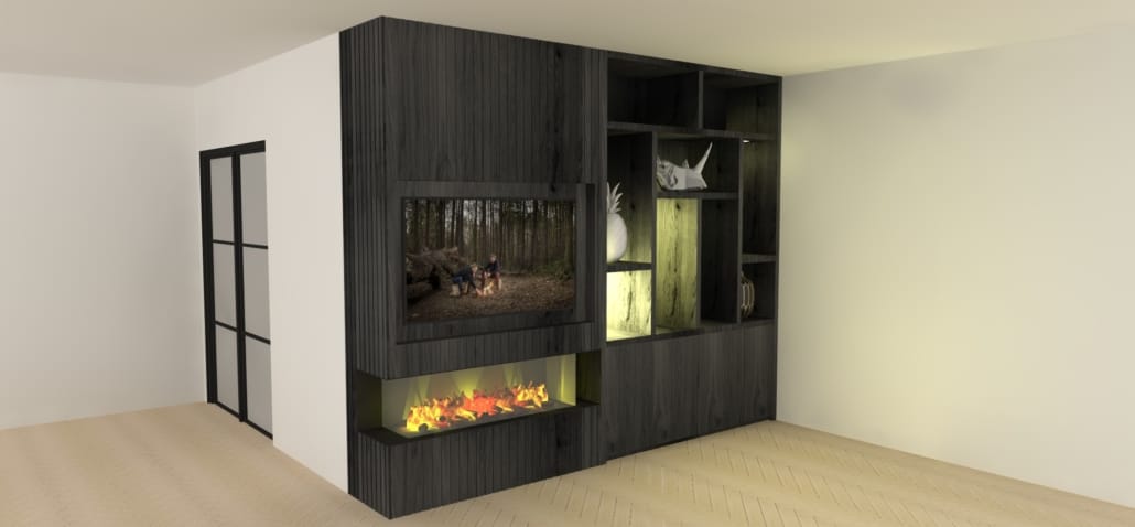 In deze woonkamer komen stijl, rust en warmte perfect samen. Het maatwerkmeubel van RebelWood vormt een krachtig middelpunt in de ruimte. De verticale lijnen en diepe, donkere houttint geven het interieur een luxe uitstraling, terwijl de geïntegreerde haard en televisie zorgen voor balans tussen functionaliteit en sfeer.