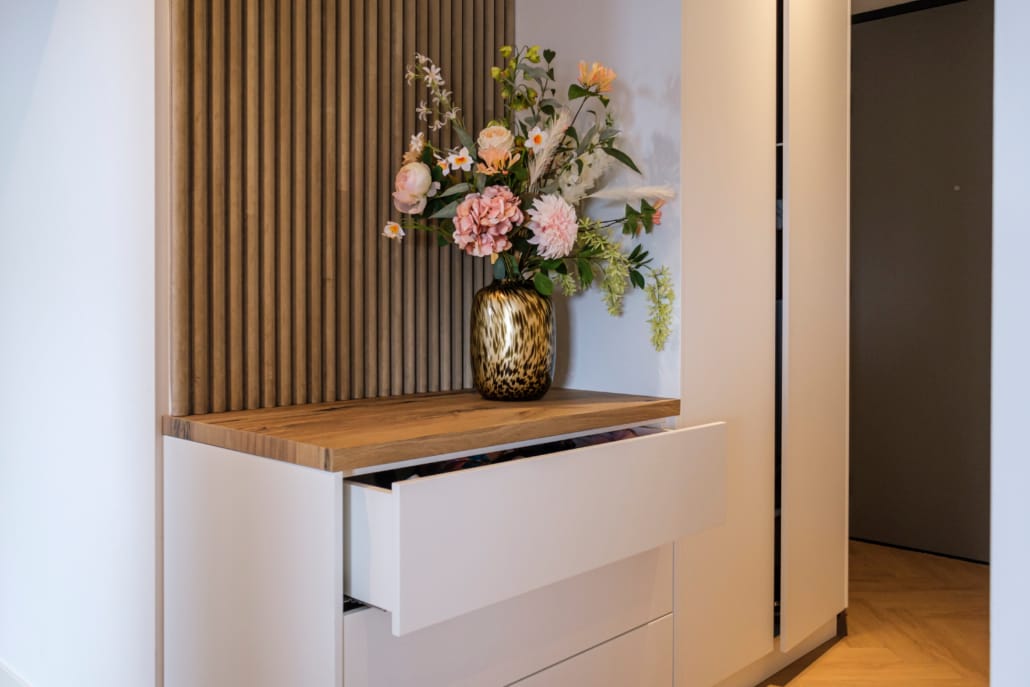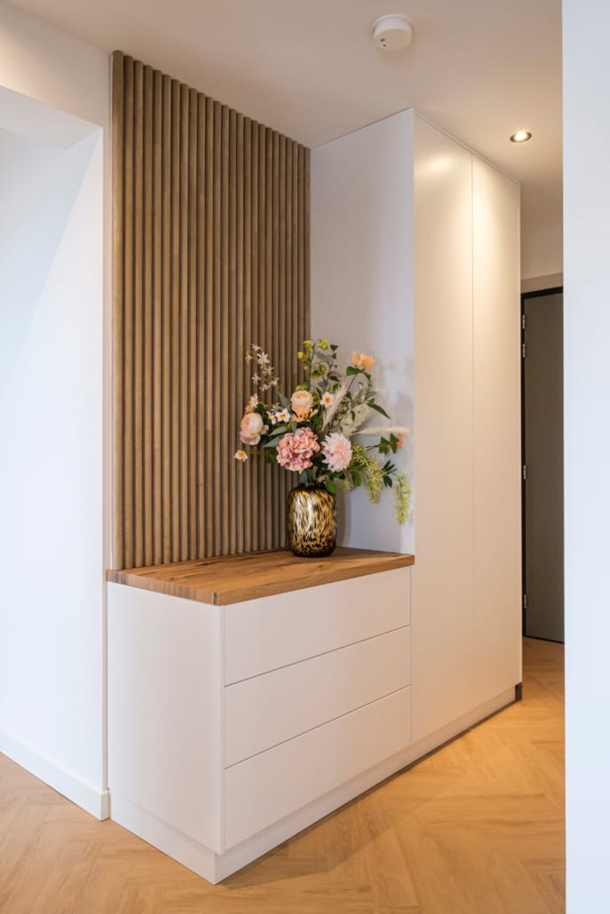 In dit appartement vormt het maatwerk dressoir van RebelWood een warm welkom bij binnenkomst. Het meubel combineert verfijnd design met een praktische indeling en zorgt zo voor rust en harmonie in de entree.